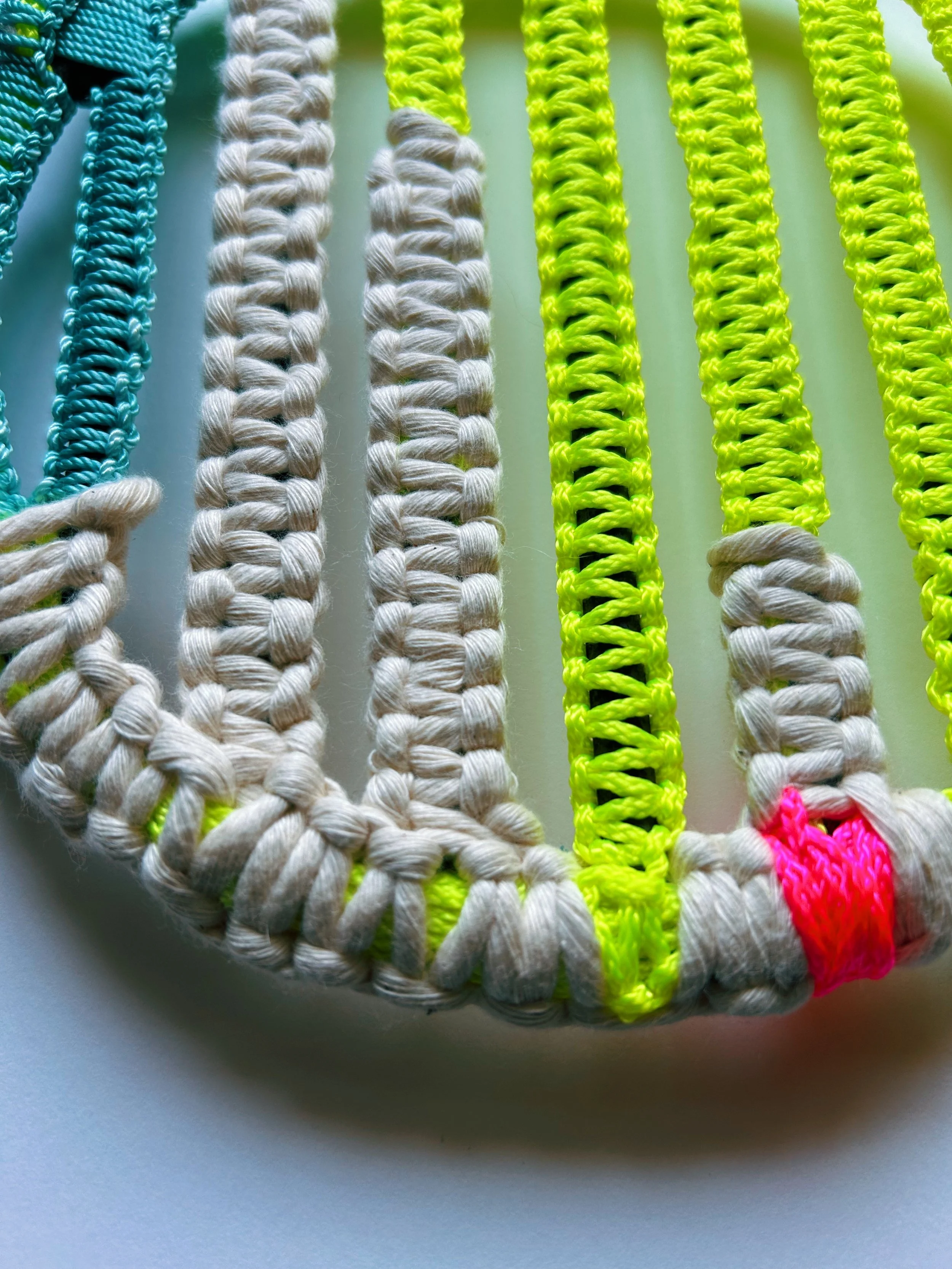 /// original woven tapestry wall hanging made of wool, waxed hemp, fishing line, and glass beads